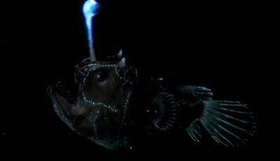 A deep sea angler fish flashes in the darkness to attract prey.