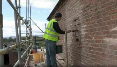 Builders begin to resolve the structural problems in Rock Farm by putting reinforced steel stitching rods into the crumbli...
