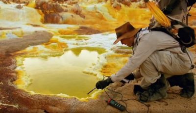 The team explore the volcano system in Dallol, in the Danakil Depression.